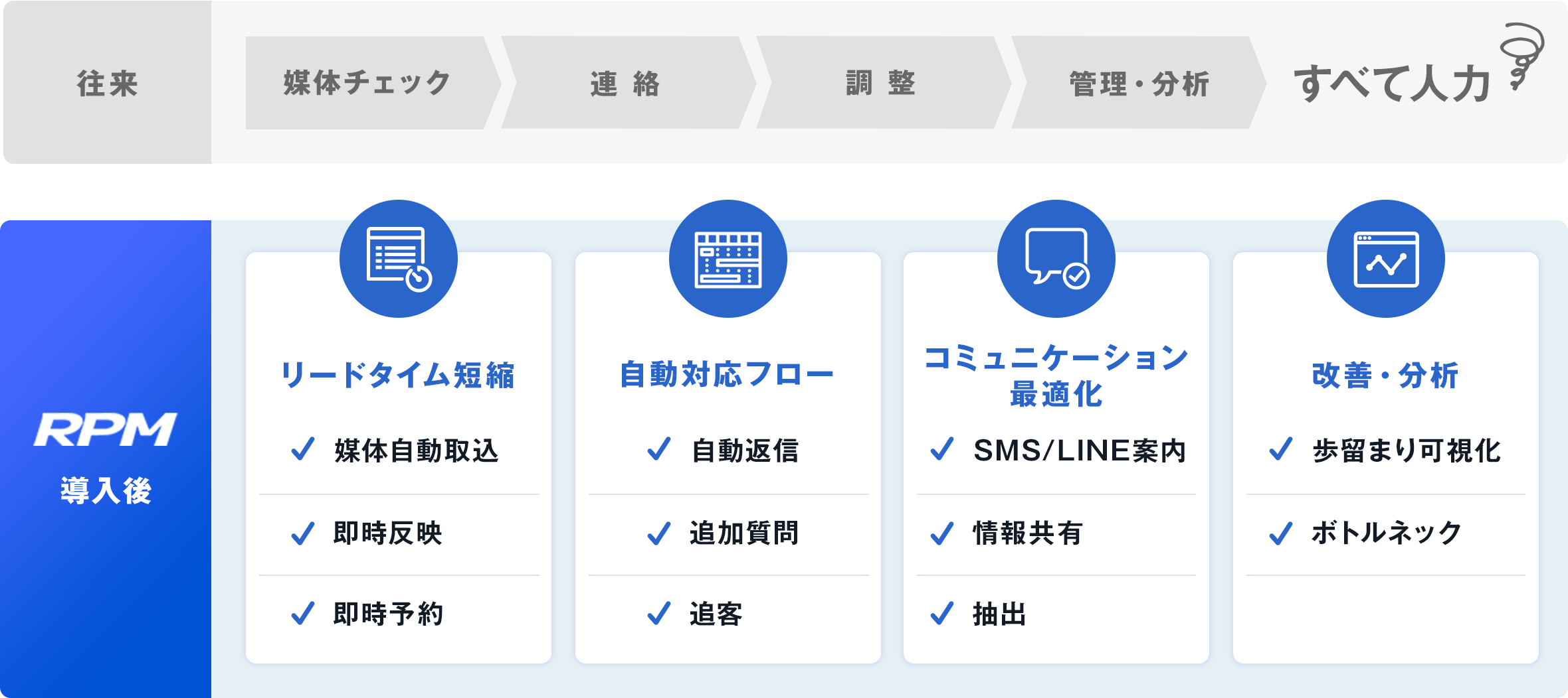 リマインドや追客も自動で行い、歩留まり改善と工数削減を同時に実現します。
