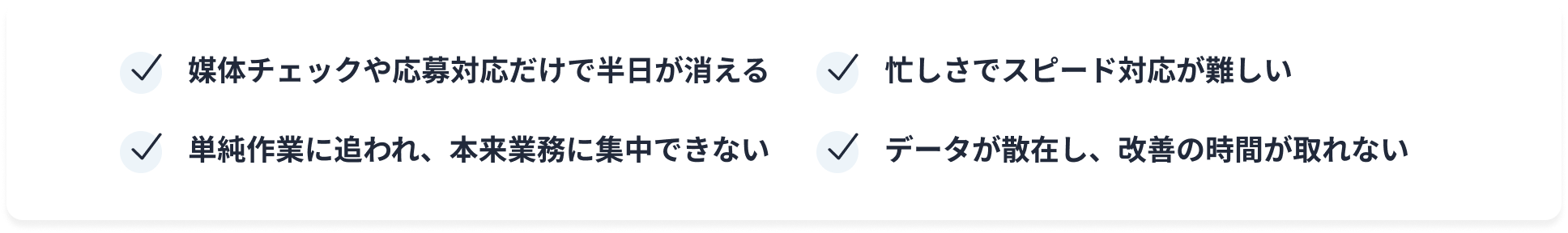 応募が増えると媒体も増え、 多くのATSではデータ項目が揃わず、連携が限定的に。 その結果、手動対応が増え対応スピードも落ちがち。