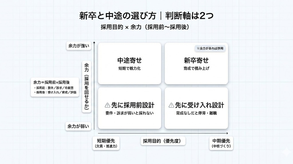 新卒採用と中途採用の違いを比較!人事が採用戦略で迷わなくなる判断軸を解説