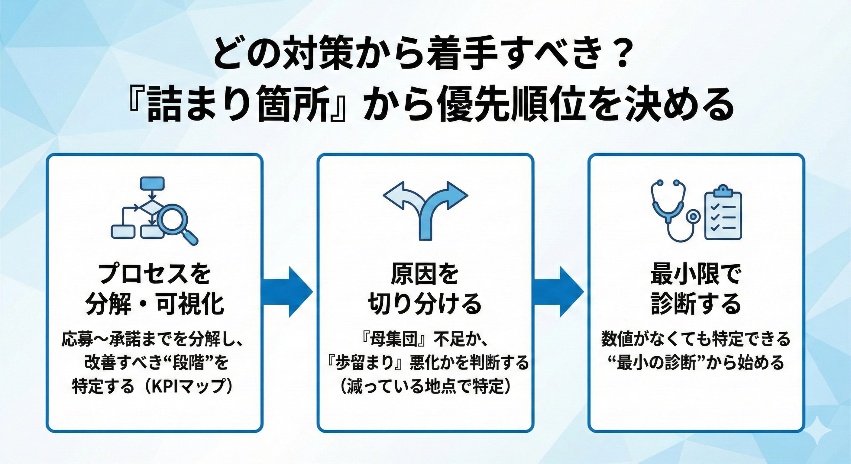 完璧な分析を目指すよりも、まずは最小限の診断で方向性を定めることが、改善を前に進める近道です。