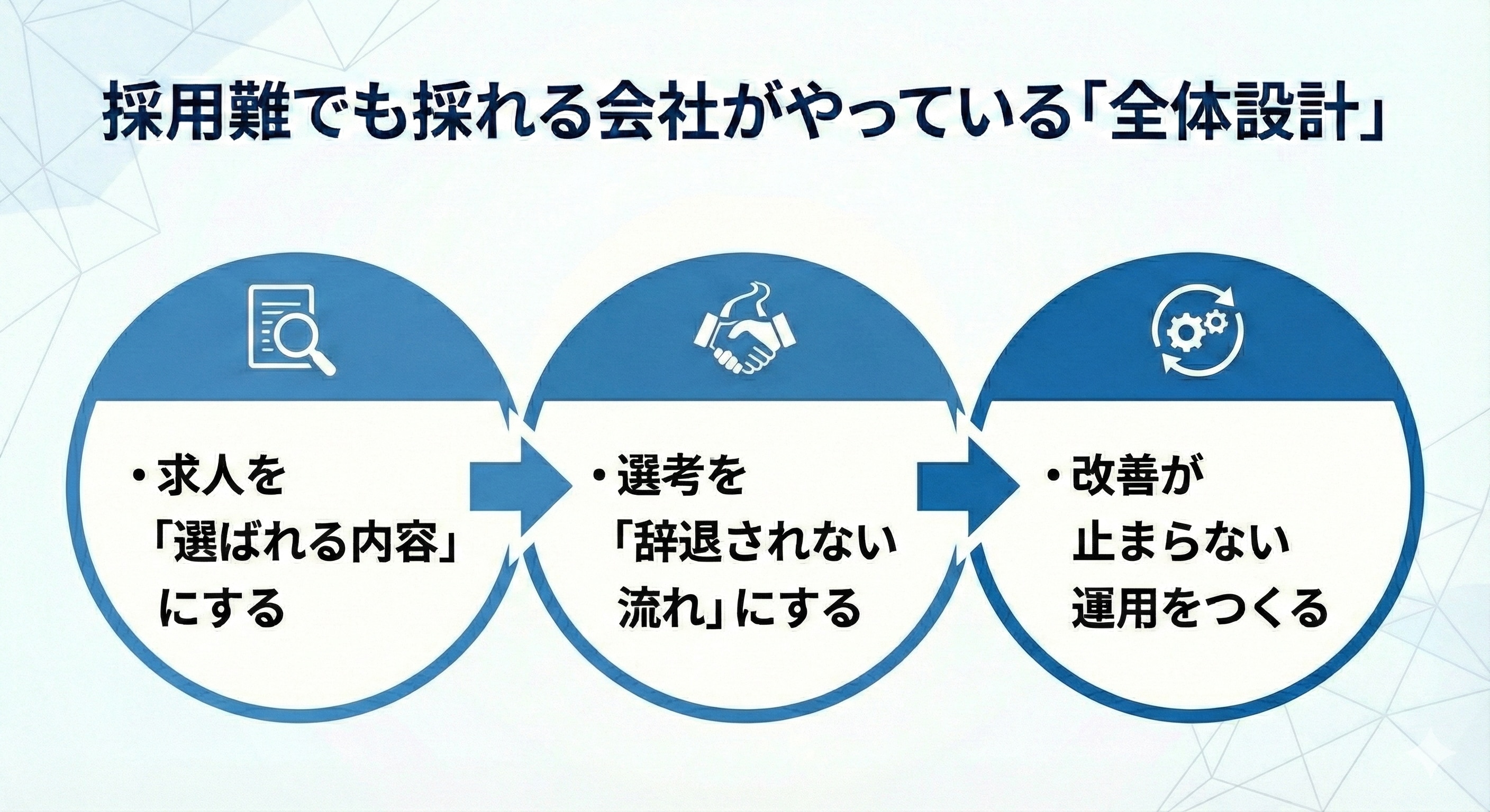 採用難の環境では、各工程を個別に最適化するのではなく、「辞退されない流れ」として全体を設計することが重要です。一つでも欠けると、採用成果は大きく下がります。