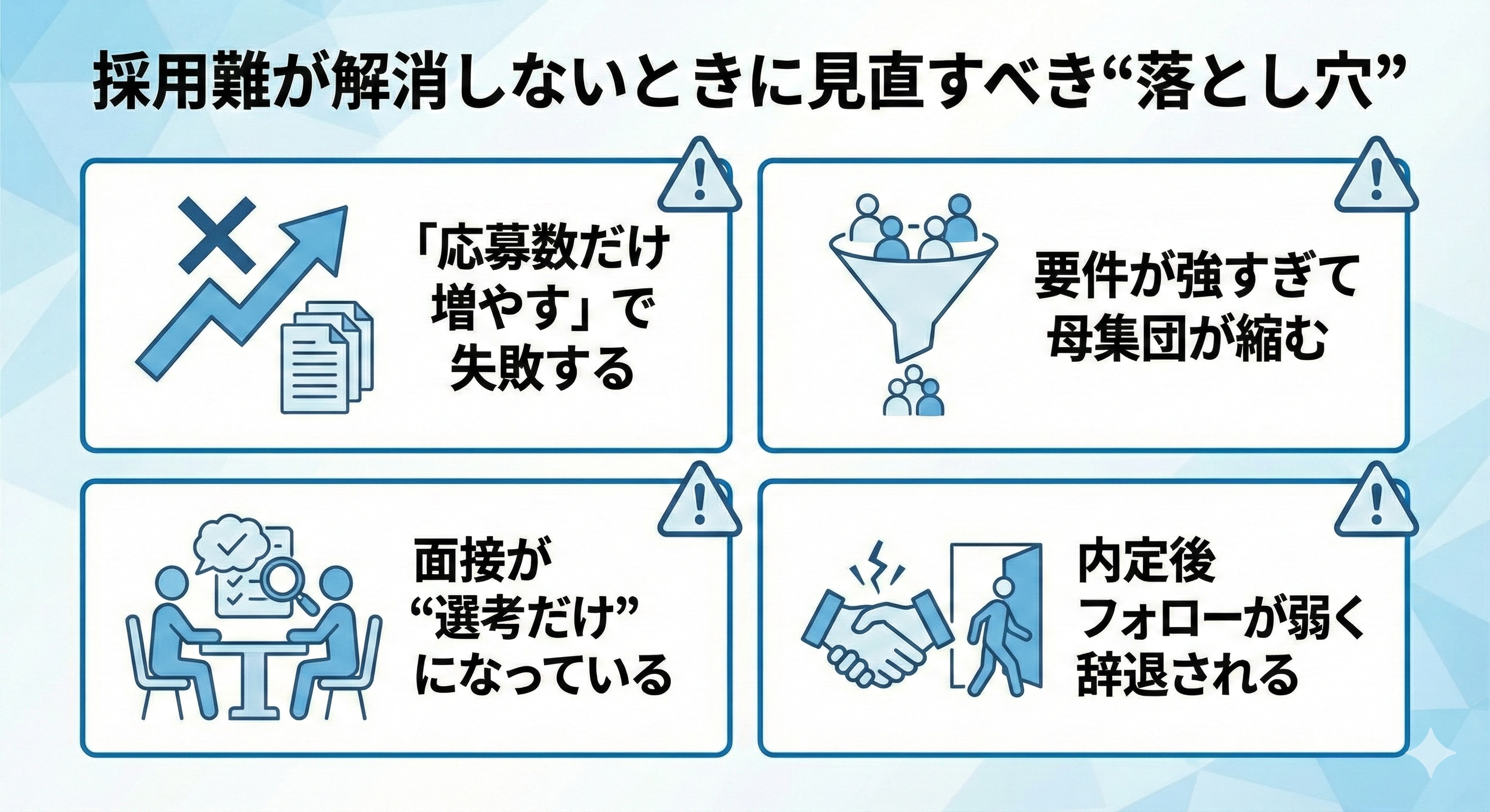 ここでは、多くの企業が無意識に陥りがちな、採用成果を下げる典型的な落とし穴を整理します。
